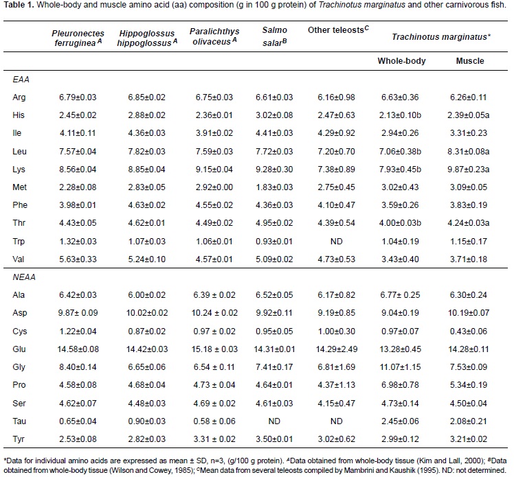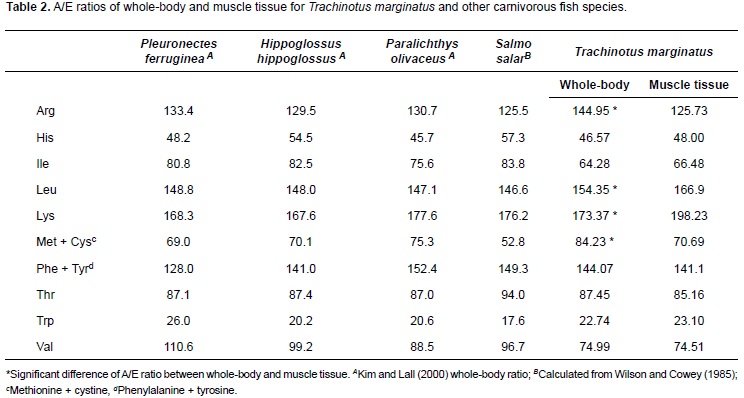 Whole–body and muscle amino acid composition of T. marginatus is presented in Table 1. Hystidine, leucine, lysine and threonine were present in higher concentrations (p<0.05) in the muscle tissue than in the whole–body. On the other hand, arginine, isoleucine, methionine, phenylalanine, tryptophan and valine did not present significant differences (p>0.05) between whole–body and muscle composition.