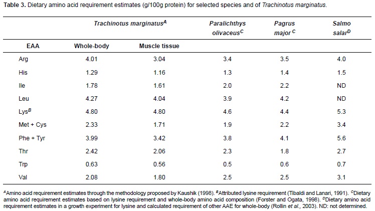 A requirement estimate of EAA is an important input in the formulation of cost–effective, goodquality feeds for fish. According to the NRC (2011) EAA requirements have been established for few fish species. Generally, EAA requirements have been experimentally estimated by feeding diets containing graded levels of the particular amino acid to be examined (Ahmed, 2012; Khan, 2012). This methodology is considered costly and time consuming. On the other hand, measurement of whole–body EAA composition has been used to estimate dietary EAA requirements for several fish species (Meyer and Fracalossi, 2005; Bicudo and Cyrino, 2009; Hossain et al., 2011), being an inexpensive and rapid alternative to dose–response studies. Arai (1981) introduced the concept of A/E ratios [(EAA / total EAA) * 1000] when formulating diets for coho salmon (Oncorhynchus kisutch). In his study, fish receiving diets supplemented with amino acids to simulate whole–body A/E ratio had improved growth and feed efficiency. Wilson and Poe (1985) found a strong correlation (r = 0.96) between body amino acid composition and EAA requirements of Ictalurus punctatus. Moreover, Wilson (2002) reported a good correlation between EAA requirements determined by the traditional method with those calculated from whole–body amino acid concentration for channel catfish.