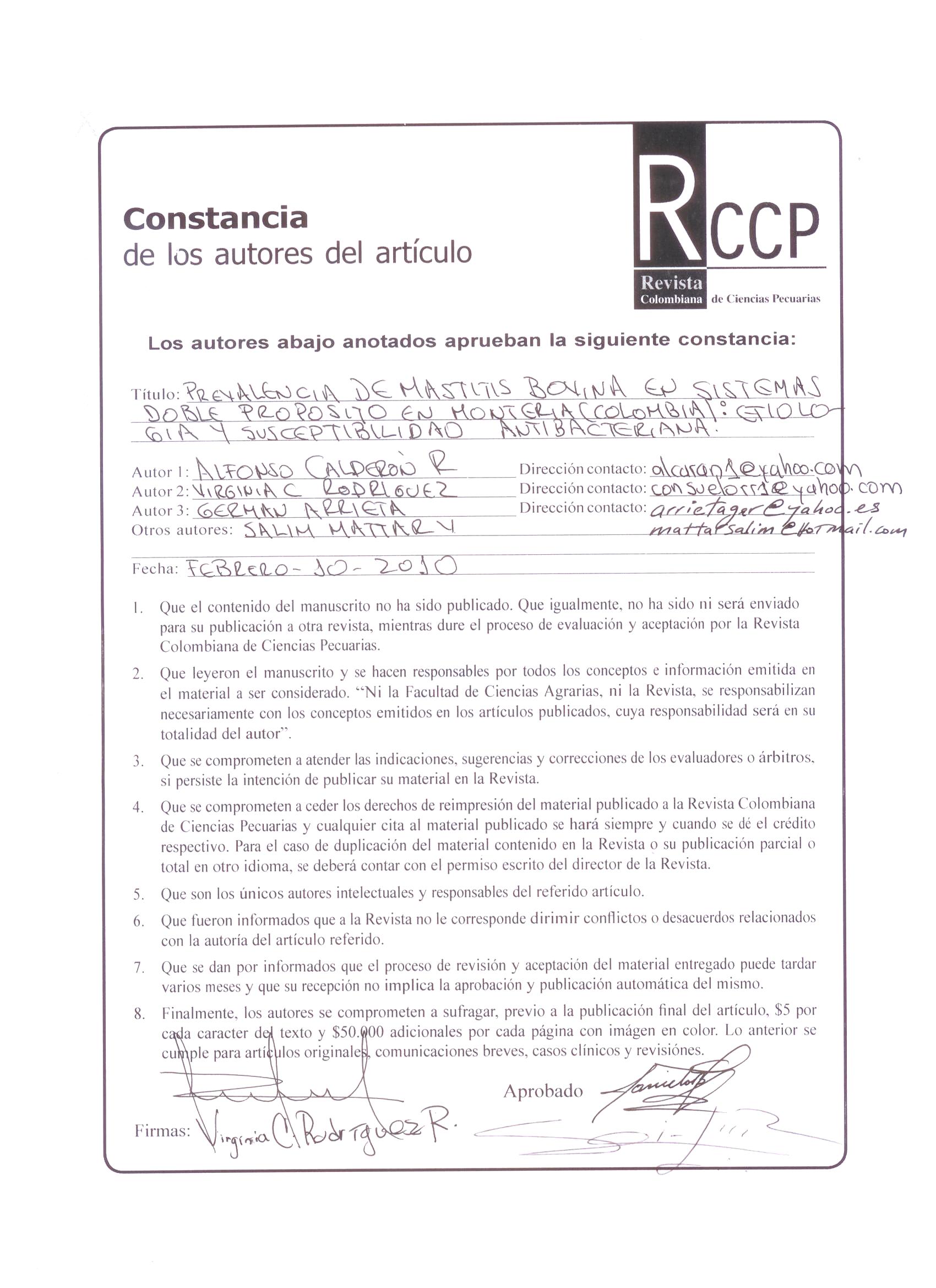 Mediante o teste do California Mastites Test (CMT), foram avaliados 4260 quartos pertencentes a 1065 vacas em 15 fazendas que laboram no sistema carne e leite no município de Montería (Córdoba, Colômbia), seleccionadas no sistema de amostragem não probabilístico. Dos quartos com traços, de casos subclínicos e clínicos, foi tomada uma amostra de leite para isolar os microorganismos envolvidos na mastite bovina. O 11.30% (n=480) dos quartos foram positivos para mastite subclínica. O 92.21% dos isolados apresentaram microorganismos infecciosos. Staphylococcus aureus, foi isolado no 7.56% e foi reconhecido como o principal patógeno isolado. Foram isolados nas amostras: Staphylococcus coagulasa negativos (0.3%), Streptococcus agalactiae (2.10%), Streptococcus uberis (3.60%) e Corynebacterium bovis (2.10%). O Staphylococcus aureus foi o principal agente etiológico e foi sensível aos antibióticos usualmente usados nos programas de prevenção e controle de mastite bovina nos sistemas de duplo aptidão no município de Montería.