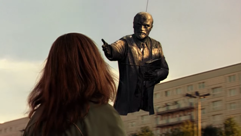 Nota. Christiane observa cómo una estatua de Lenin es retirada con una grúa, sin darse cuenta de que representa un cambio político que ignora por completo. Escena extraída de Wolfgang, 2003, 1:23:12