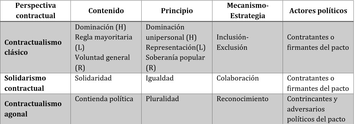 Con base en lo anterior, la perspectiva contractualista agonal se problematiza desde un punto de vista normativo que en buena medida caracteriza la reflexión de los clásicos sobre el contrato social. A su vez, desde un ámbito empírico o inductivo que resulta pertinente en contextos de violencia prolongada donde se cohabitan instituciones políticas y actores que luchan por el establecimiento de nuevos órdenes sociales.