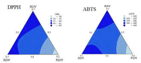 Results: The mixture design was employed with minimum-maximum constraints to obtain the optimized beverage formulation based on the blend of three types of quinoa malt [black quinoa malt (BQM), red quinoa malt (RQM), and white quinoa malt (WQM)]. The response variables were antioxidant activity using the DPPH and ABTS methods. Each of the response variables was maximized and fitted to the quadratic regression model. The optimum formula had 70% black quinoa malt (BQM), 20% red quinoa malt (RQM) and 10% white quinoa malt (WQM). Antioxidant capacity increased from stage to stage from 45.11 ± 0.26 µg TE/g in sprouted quinoa (SQ) to 767.55 ± 4.94 µg TE/g in quinoa malt-based beverage with the inclusion of blueberry pulp (QMB) using the DPPH method and from 271.64 ± 1.23 µg TE/g in SQ to 834.32 ± 2.14 µg TE/g in QMB using the ABTS method. The sensory evaluators rated QMB between "good" and "super good" according to the attributes of odor, color, taste and appearance, evaluated.